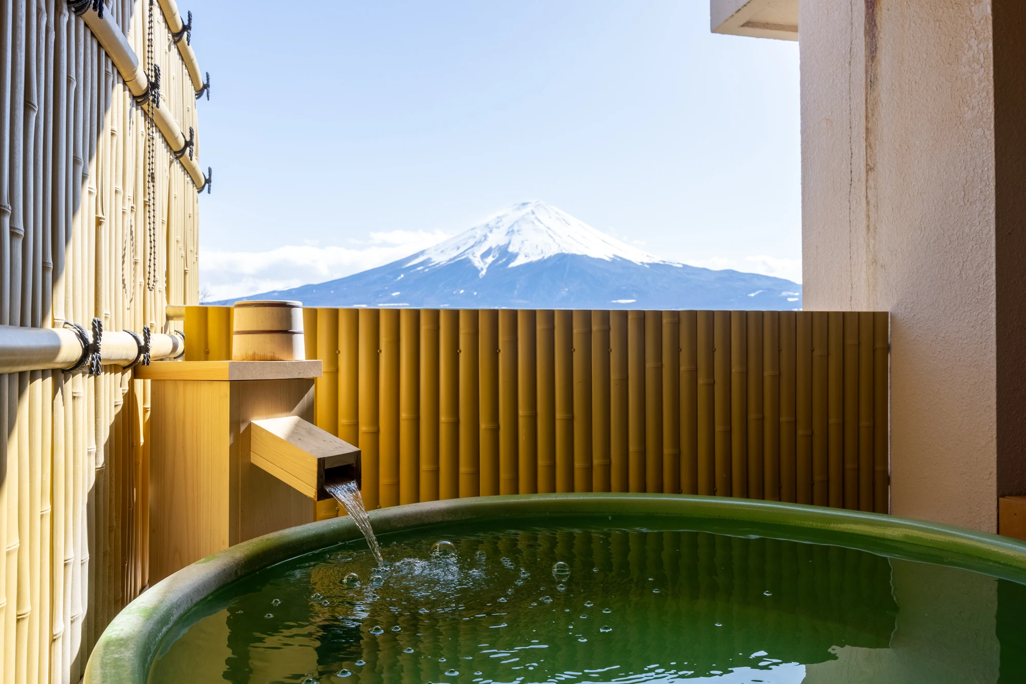 Enjoy the ever-changing beauty of Mt. Fuji through the seasons to the fullest from your open-air bath. A luxuriously spacious 17.5-tatami Japanese room and a relaxing twin room. The beds are from "Simmons" to ensure a comfortable sleep. This is our finest, most spacious, and premium special room.